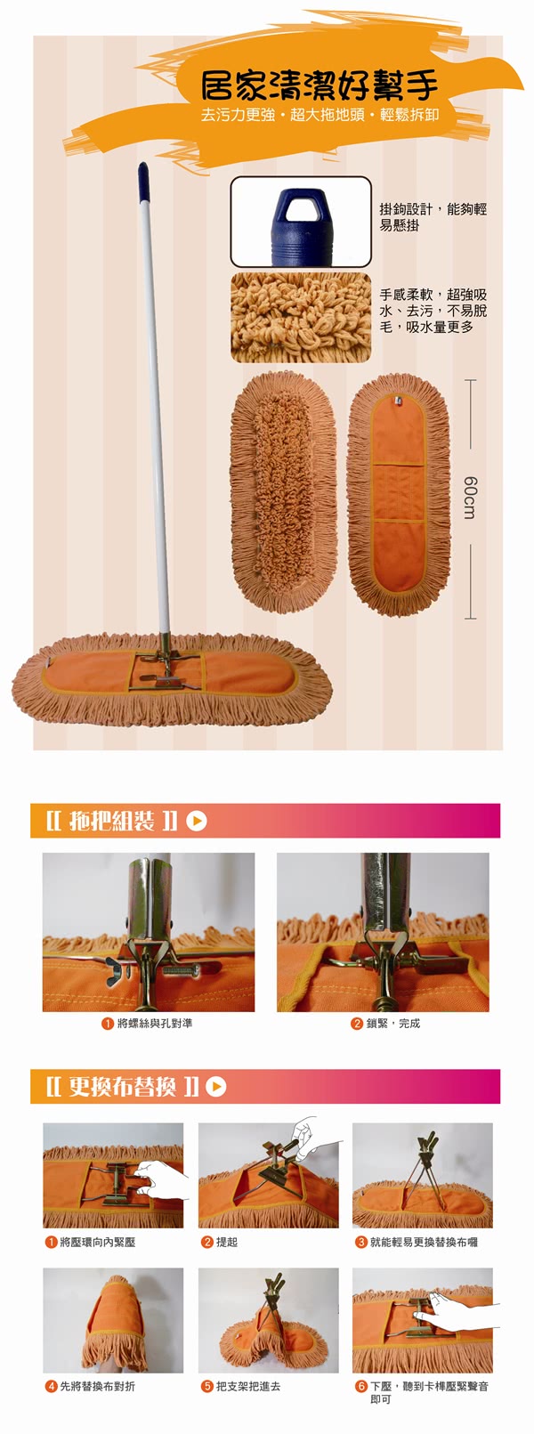 ●拖把架對折式卡榫絕對緊扣不脫落、方便替換布